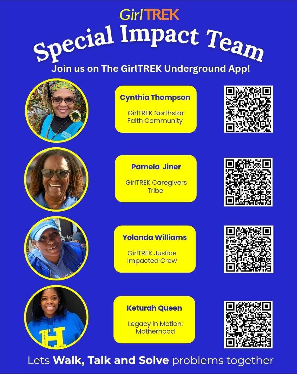 If members of your ministry, crew or congregation are interested in connecting more deeply, they can join our Special Impact communities through the GirlTREK Underground App by simply scanning the QR codes on the flyer. Each space offers a unique opportunity for women to find support, build relationships, and grow within their specific journeys.