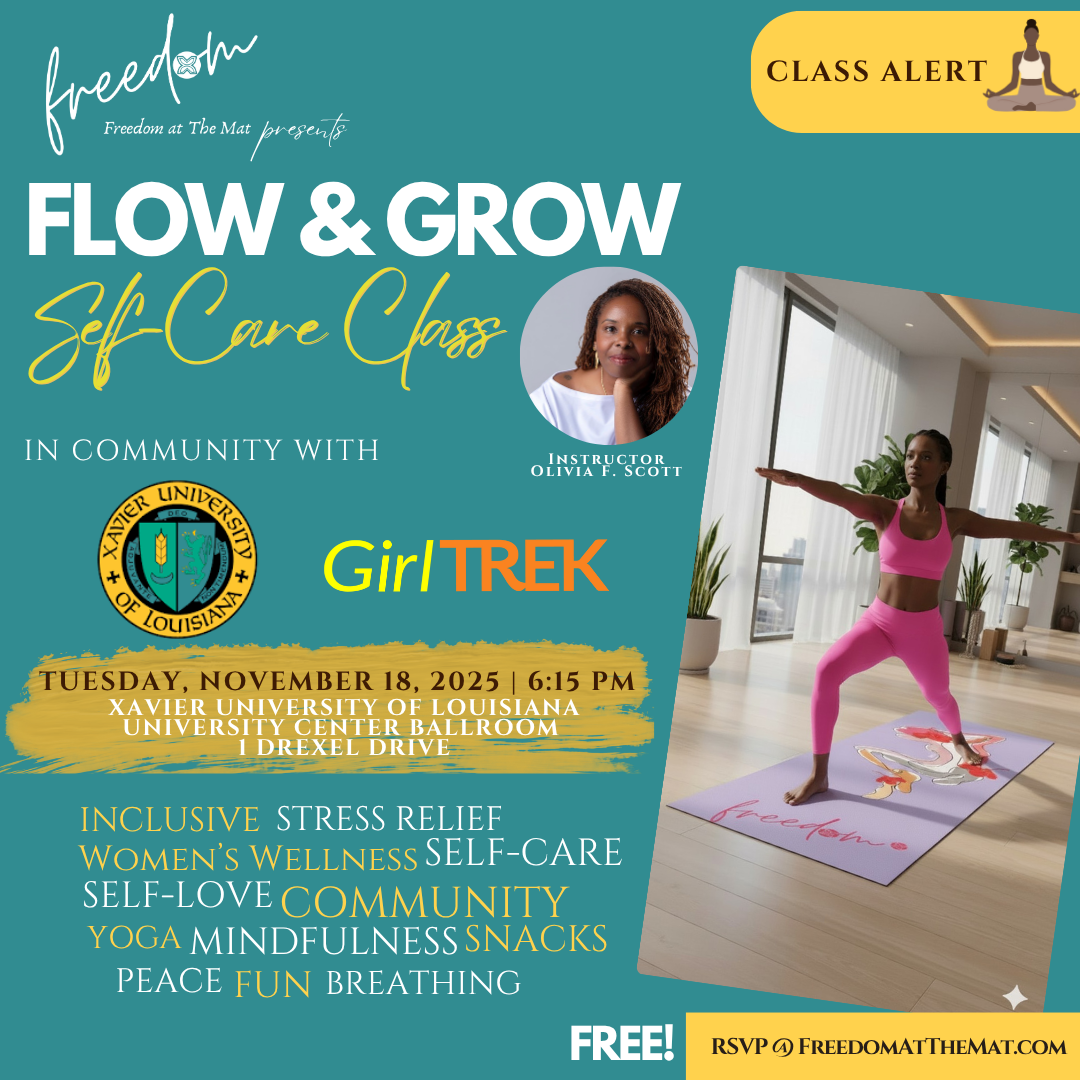We’d love to invite you to pause, breathe, and pour back into yourself. Join GirlTREK as we partner with Freedom at the Mat and Xavier University of Louisiana for a rejuvenating Flow & Grow yoga and connection experience.