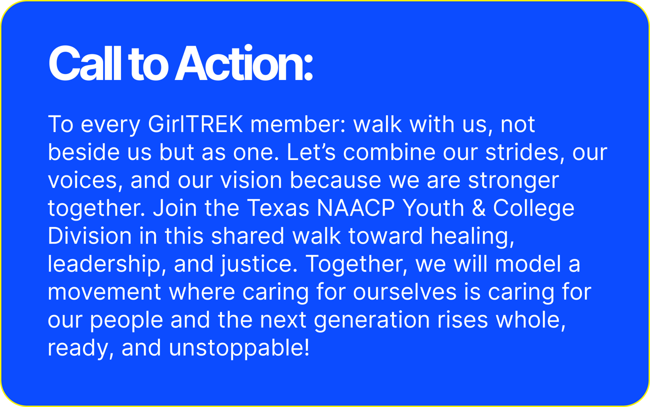 The Texas NAACP Youth and College Division stands with GirlTREK’s 10th Demand: Next Generation Leadership by defying the myth that healing is not the beginning of great work. We believe that preservation is power: to effectively advocate, teach, and lead, we must first honor our own health. Healing is how we sustain the mission and ensure that the next generation of leaders can carry the torch of equality for all marginalized communities.